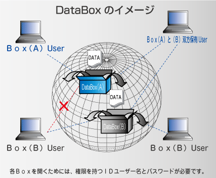 DataBoxはインターネット上の私書箱みたいなものです。セキュリティーの掛かったネット上のフォルダ(BOX)に権限を持ったユーザーがログオンすることで、データの出し入れが可能になります。